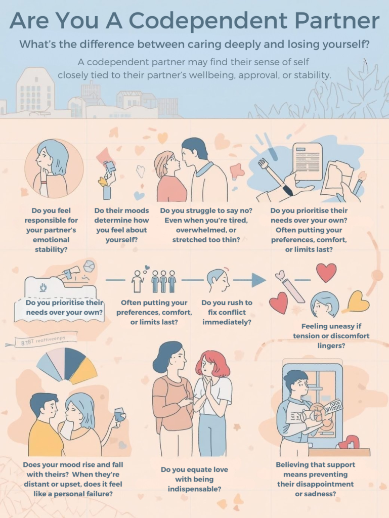 Codependent patterns are rarely obvious from the inside. They feel normal because they are driven by good intentions. Still, certain experiences tend to repeat. You may feel uneasy when your partner is upset, even when the situation has nothing to do with you. There can be a strong urge to smooth things over immediately. Waiting can feel unbearable. Saying no might bring guilt rather than relief. You might agree to things that stretch your energy, time, or comfort, then quietly resent the strain. Your mood may rise and fall with your partner’s. When they are distant, distracted, or critical, it can feel like a personal failure instead of a passing state.